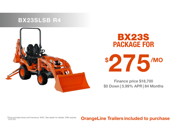 BX23SLSB – R4 tires – QA – 3 point hitch – 12″ bucket
