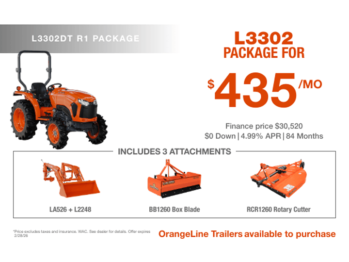 0% Down, 4.99% A.P.R. financing for up to 84 months on purchases of select new Kubota equipment is available to qualified purchasers through Kubota Credit Corporation, U.S.A.; subject to credit approval. Offers expire 2/28/26. Terms subject to change.