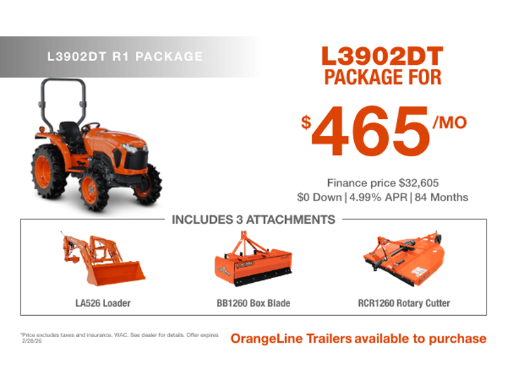 0% Down, 4.99% A.P.R. financing for up to 84 months on purchases of select new Kubota equipment is available to qualified purchasers through Kubota Credit Corporation, U.S.A.; subject to credit approval. Offers expire 2/28/26. Terms subject to change.