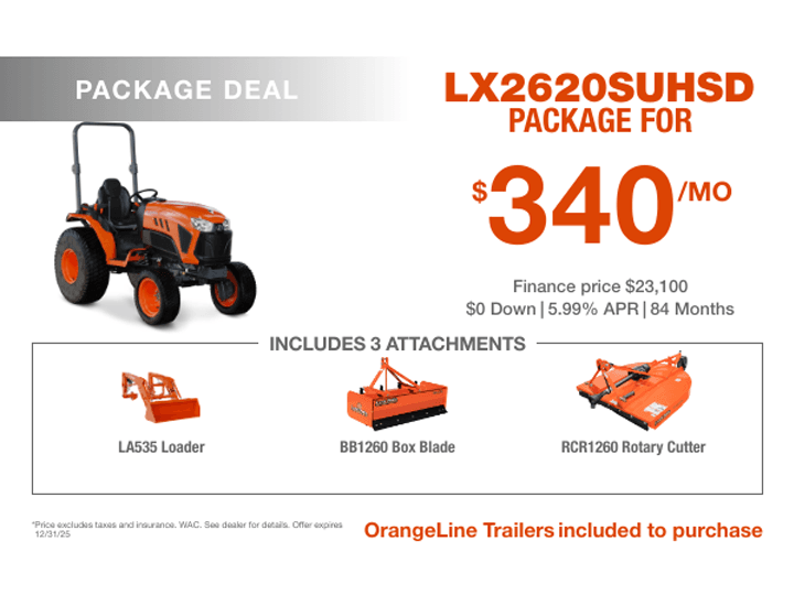0% Down, 5.99% A.P.R. financing for up to 84 months on purchases of select new Kubota equipment is available to qualified purchasers through Kubota Credit Corporation, U.S.A.; subject to credit approval. Offers expire 10/31/25. Terms subject to change.